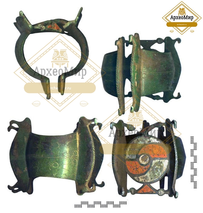 Описание: Браслет ажурный, манжетовидный. Шипообразные выступы заканчиваются зооморфными изображениями, шина браслета украшена специфическим орнаментом. В центре шины эмалевый медальон с мотивом "сегнерова колеса".