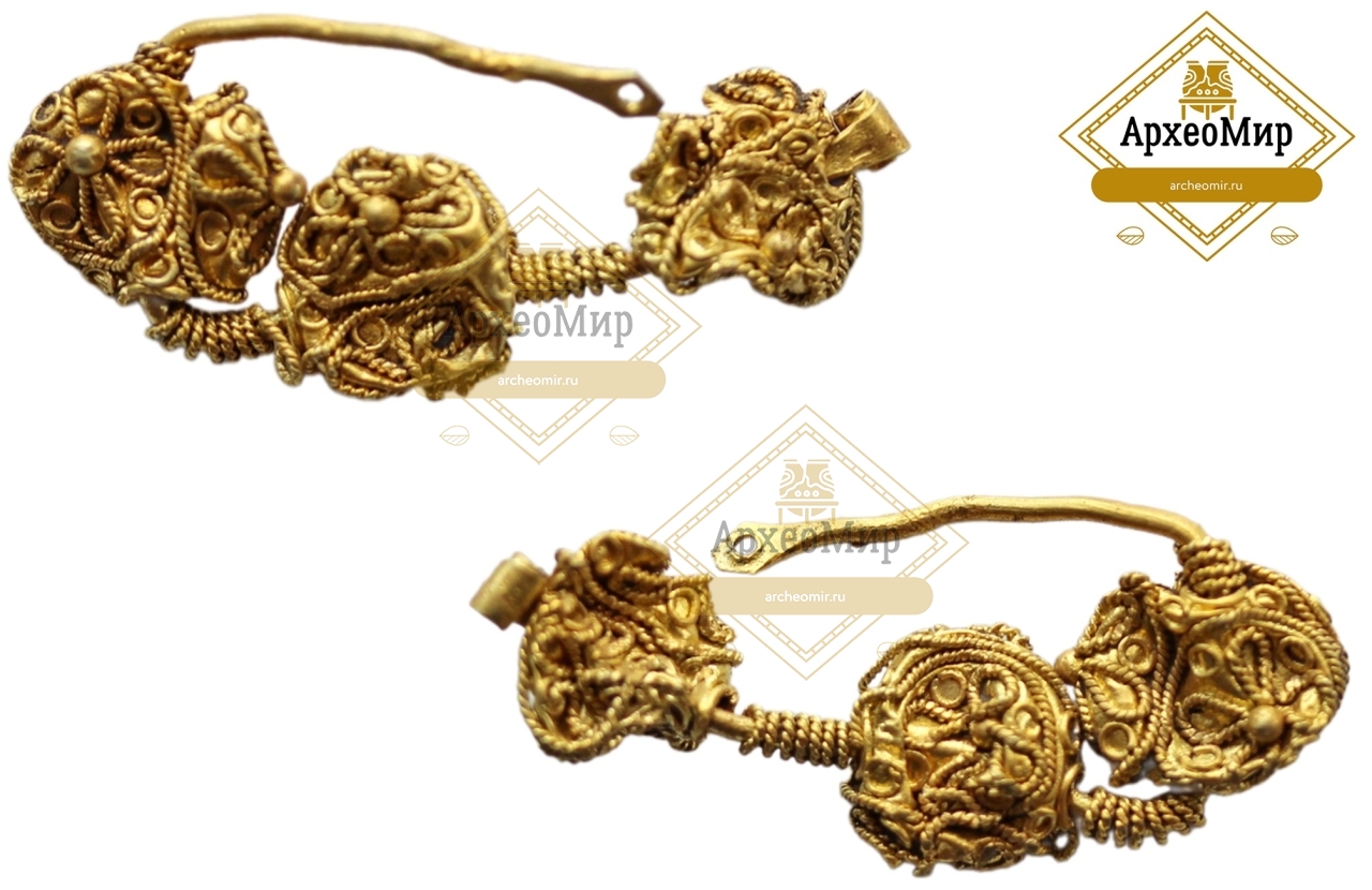 Трехбусенное височное кольцо филигранно-зерненое