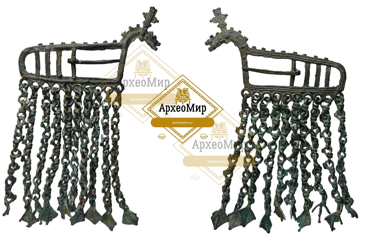 Описание: Женская зооморфная поясная пряжка с навершием в виде головы конька в начельнике, образованном S-овидными завитками. По низу рамки пряжки , через крепежные кольца установлены десять лапчатых подвесок на цепочках. Наибольшее распространение данный вид пряжек получает в IX в.